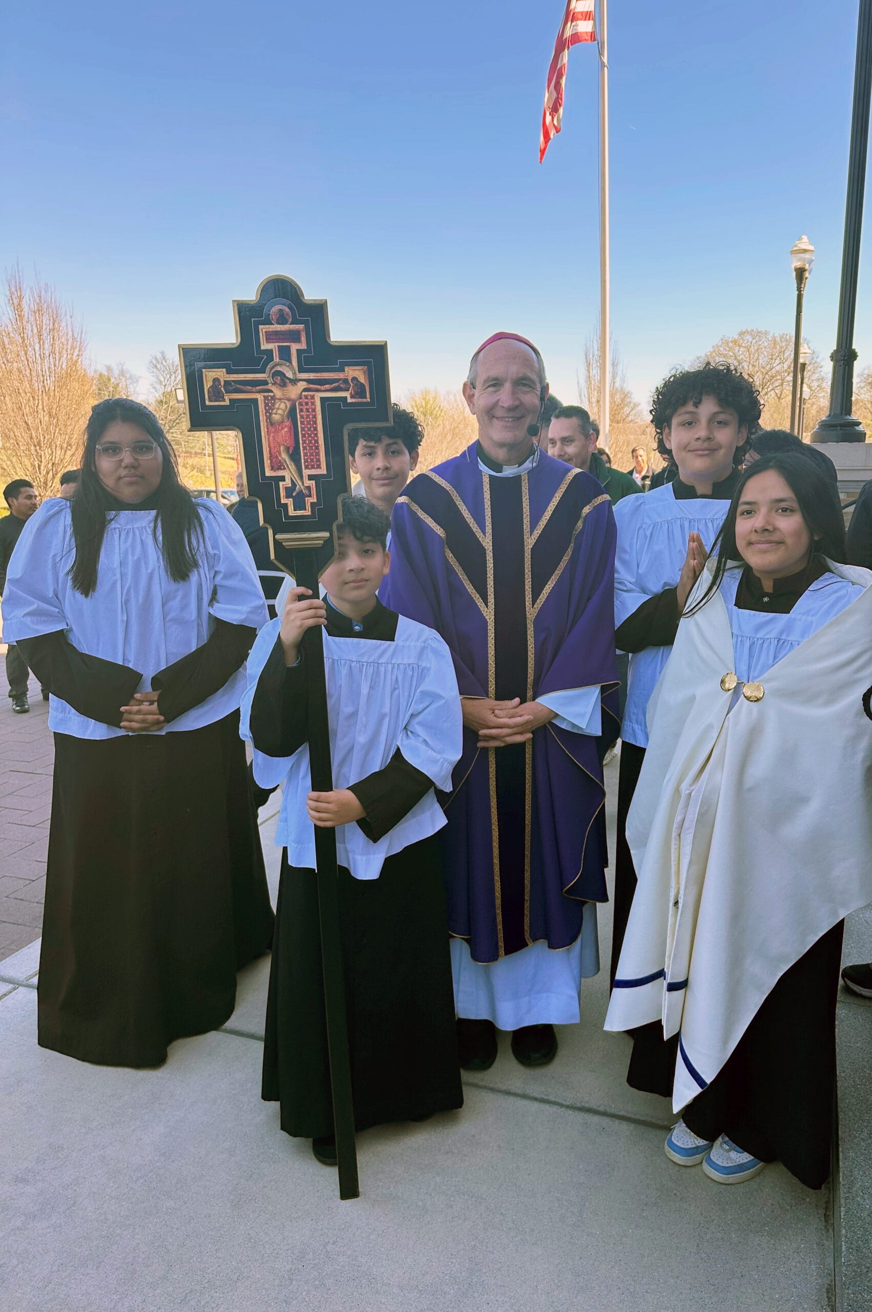 Bishop Mark Beckman is joined by altar servers at the Cathedral of the Most Sacred Heart of Jesus following Mass on March 22 that was celebrated as part of the diocesan in-service on the National Pastoral Plan for Hispanic/Latino Ministry. (Photo Blanca Palacios)