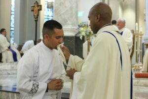 “Most important, the Lord did not create us for ourselves but to live for Him alone and to love God above all else and all things, and to love one another even as He has loved us,” the bishop said. “It is the call of every Christian to be loved, but Renzo and A.J., you will be loving God’s people in a unique and particular way as ordained priests. Your very lives are to become a gift to your people so that as you celebrate the Eucharist and say the words of the Lord, ‘This is My body given for you,’ that you become also a body given for others in love, your life poured out for them.