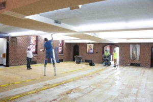 The project began June 9 and is expected to be completed July 22, assuming everything goes as planned. Since construction work began, Father Torres and associate pastor Father Andrew Crabtree have been celebrating daily Mass in the parish life center, which is just outside the church nave and sanctuary. Sunday Masses have been celebrated in the OLPH School gym.
