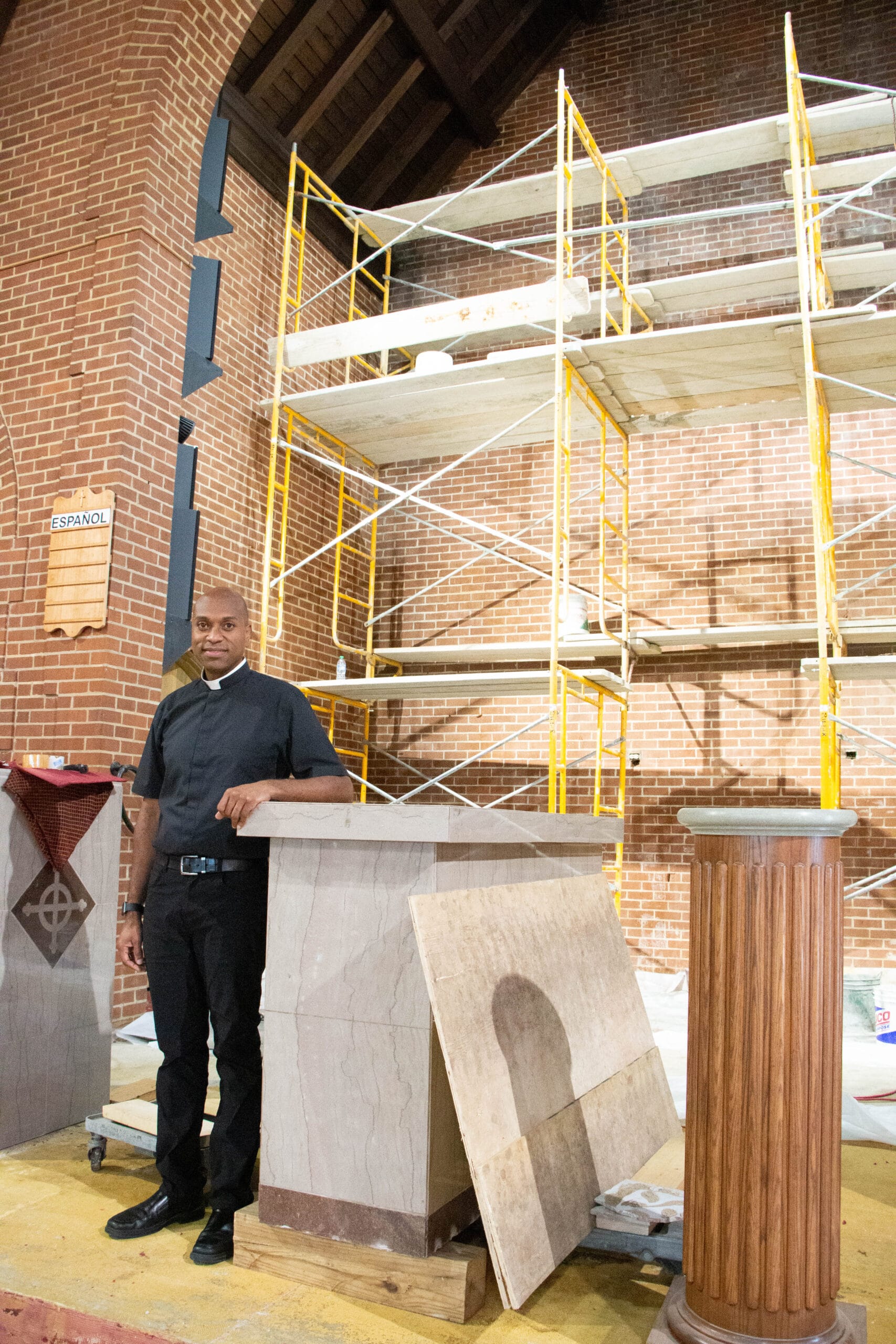 Father Arthur Torres, pastor of Our Lady of Perpetual Help Parish in Chattanooga, stands in the sanctuary of OLPH Church that is being renovated. Father Torres said efforts are underway to update the church altar as part of the project. (Photo Bill Brewer)