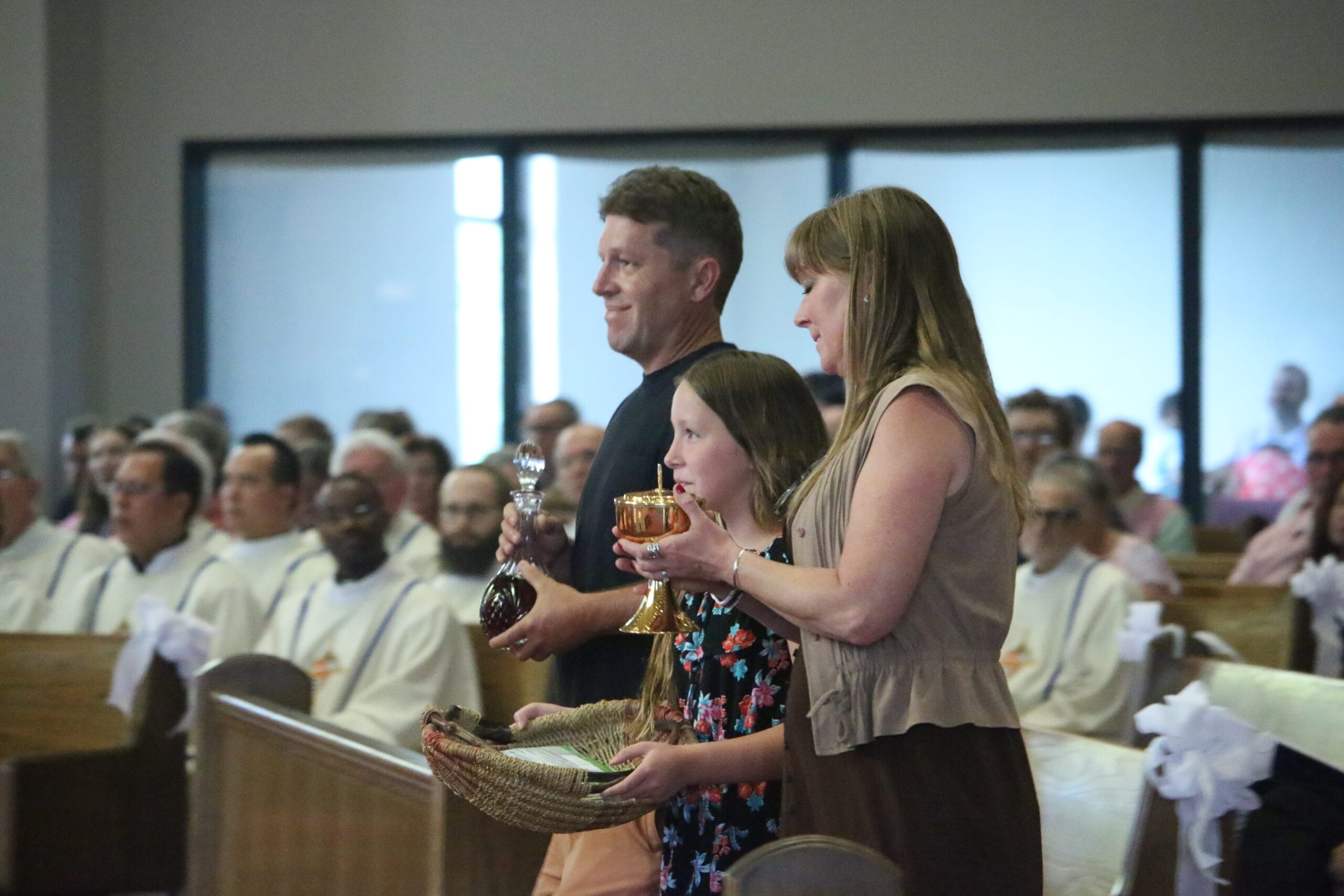 Father Cummins’ friends Brad and Hannah Burgett and daughter Ramona of All Saints Parish in Knoxville bring forth the gifts at the anniversary Mass. Mr. Burgett spoke at the dinner following Mass. (Photo Dan McWilliams)