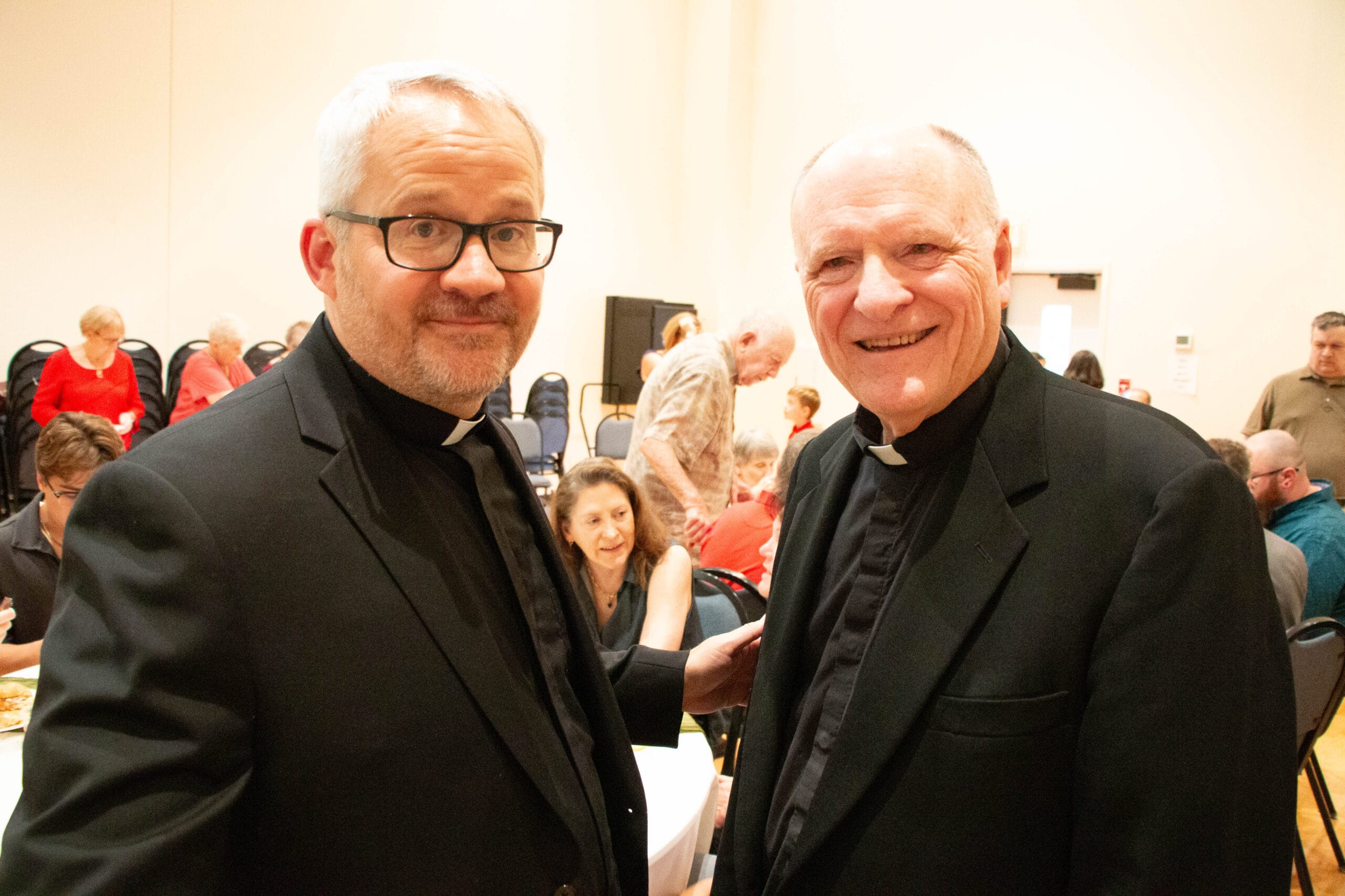 Father Cummins (left) poses with Father Mike Creson, who formerly served as chaplain at the ETSU Catholic Center and helped inspire a priestly vocation in a young Michael Cummins. (Photo Bill Brewer)