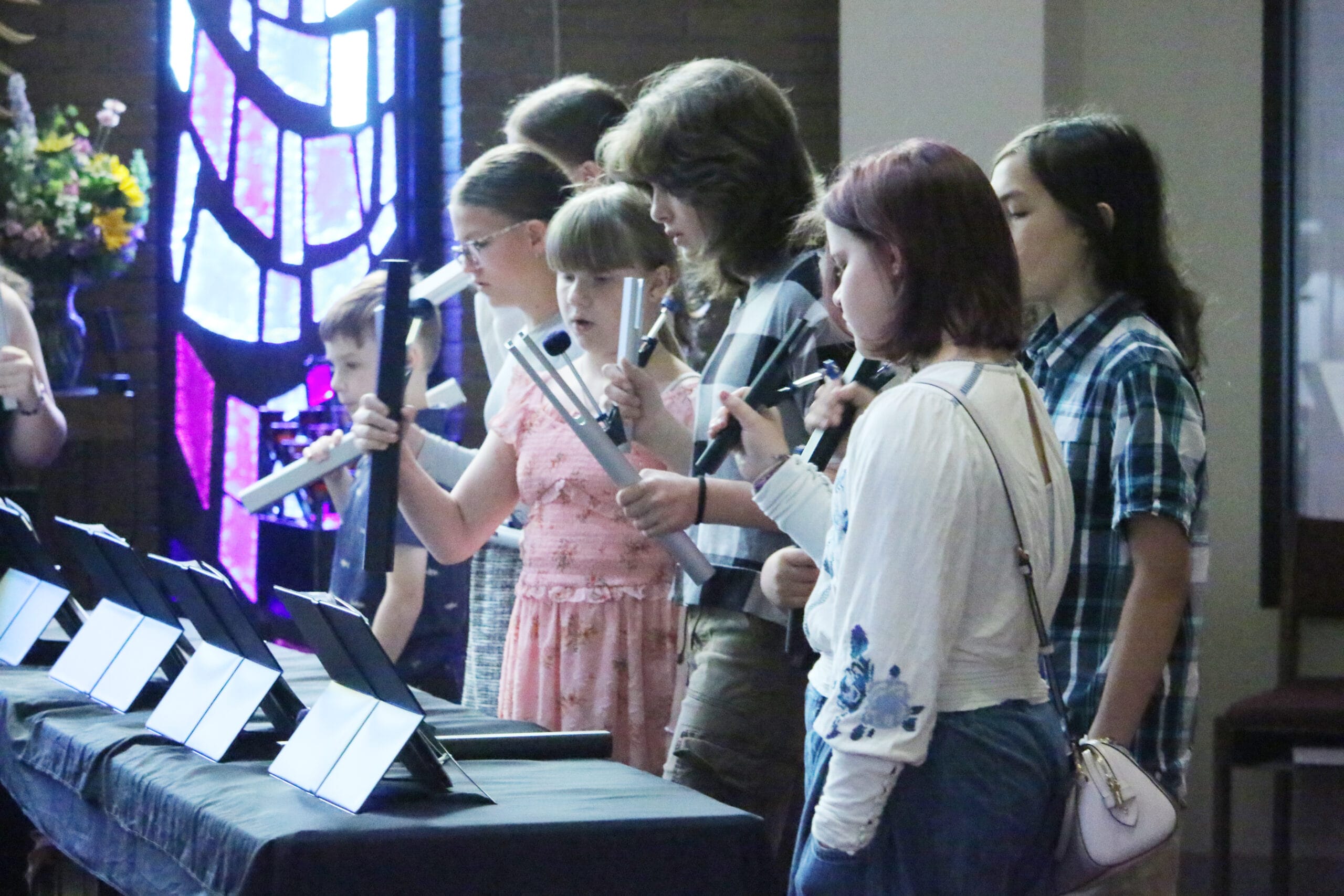The Angelic Ringers Youth Bell Choir helped provide music for Father Cummins’ 30th-anniversary Mass. From left are Patrick Reinhardt, Addisen Fain, Hannah White, Anneliese Barnette, Liz Lee, and Kaleb Mai. (Photo Dan McWilliams)