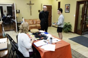 Bishop Mark Beckman engages with a student attending his class on the “Mystery of Catholicism” at the Chancery. (Photo John Mecklenborg)