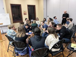 The bishop checks in with smaller groups of young adults as part of the course he is teaching. The students are deepening their faith in Christ and knowledge in the Catholic Church. (Photo Bill Brewer)