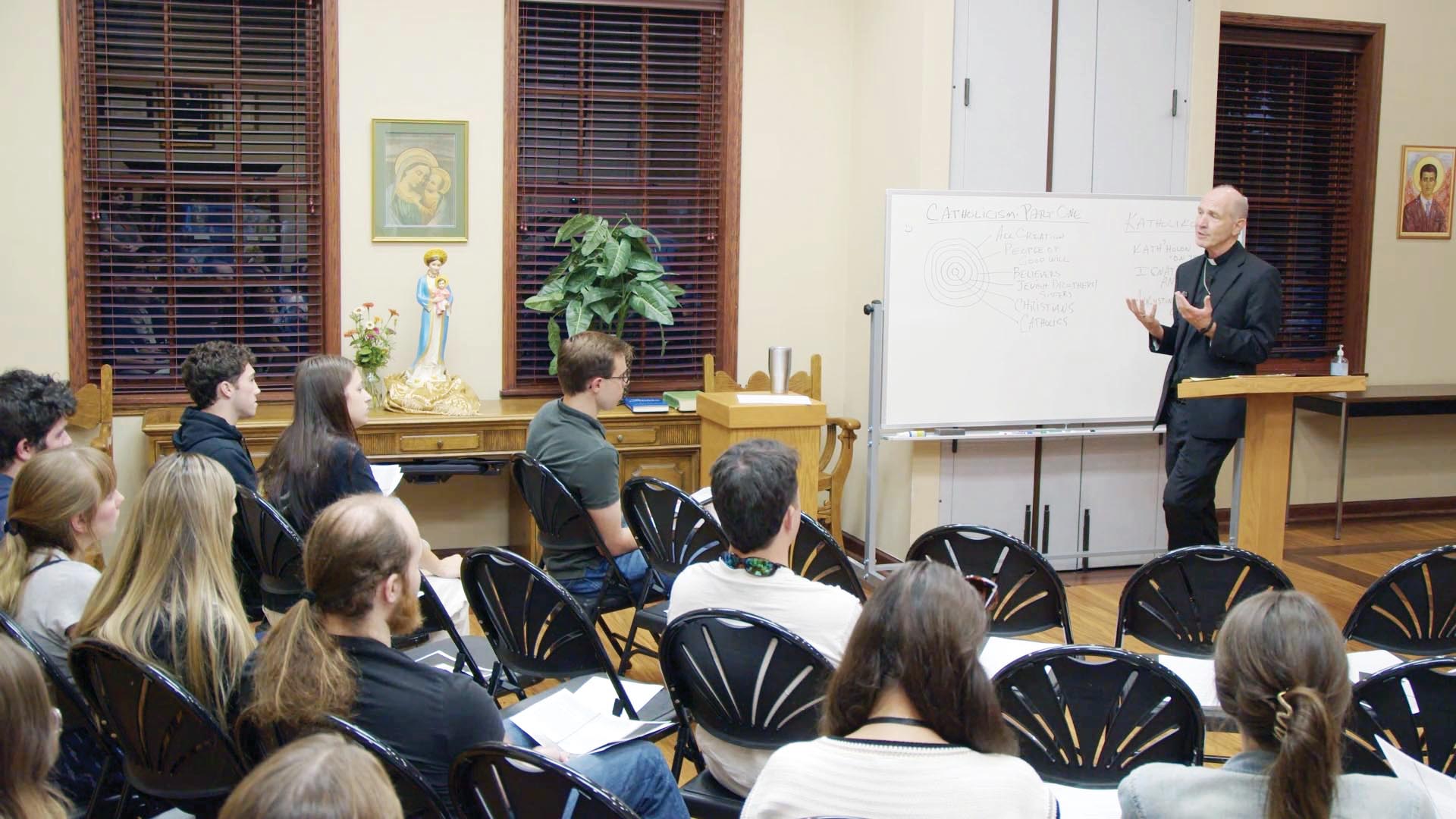 The course covers a variety of topics in Catholicism, including the origins of the faith itself, discipleship, and the structure of authority in the Catholic Church. Continuing with the origins of Catholicism, Bishop Beckman began with the root of the word itself: katholikos, Greek for universal or whole, or as the bishop explained, “everyone.”