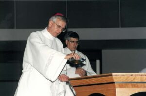 Bishop Joseph E. Kurtz blesses the altar at the new church at the dedication Mass on March 11, 2000. Pastor Father Joe Brando watches at right.