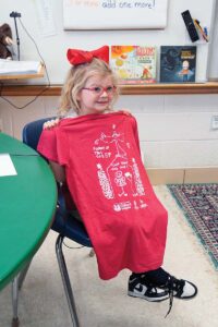 Hattie shows a T-shirt she helped create for East Tennessee Children’s Hospital, where she is a patient ambassador. (Photo courtesy of Kathy Rankin/St. Joseph School)
