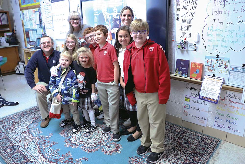 St. Joseph School principal Andy Zengel, kneeling left, is with Melissa Halter, back center, third-grade teacher Jenifer Ingram, and some of Mrs. Ingram’s students, including Hattie Halter, who is wearing a St. Joseph Bulldogs shirt, in Mrs. Ingram’s classroom. (Photo courtesy of Kathy Rankin/St. Joseph School)