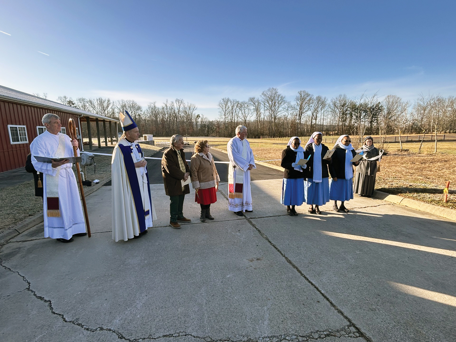 Sister Maureen Ouma, Sister Restituta Nyinoweitu, and Sister Elizabeth Wanyoike of the Evangelizing Sisters of Mary sing “Nampenda Maria” during the consecration ceremony for Holy Cross Cemetery on Dec. 20. Observing from left are Deacon Hicks Armor, Bishop Mark Beckman, Alan Sefton, Sally Sefton, Deacon Sean Smith, and Dorothy Curtis at right. (Photo Bill Brewer)