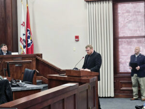 Father David Carter, addresses the Chattanooga-Hamilton County Regional Planning Commission on Jan. 12. Standing behind him is James Poston, an engineer and member of the Basilica of Sts. Peter and Paul. (Photo courtesy Maria Rist / Basilica of Sts. Peter and Paul)