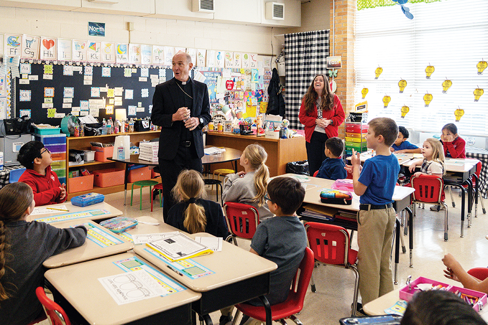 Bishop Mark Beckman visits Jackie Delaney’s first-grade class at St. Joseph School on Jan. 30 during Catholic Schools Week. The students and Bishop Beckman were having an engaging dialogue. (Photo Bee Goodman)