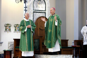 With the memorial of St. Blaise coming up on Feb. 3, Bishop Beckman and Deacon Otey gave a blessing of throats after Mass.