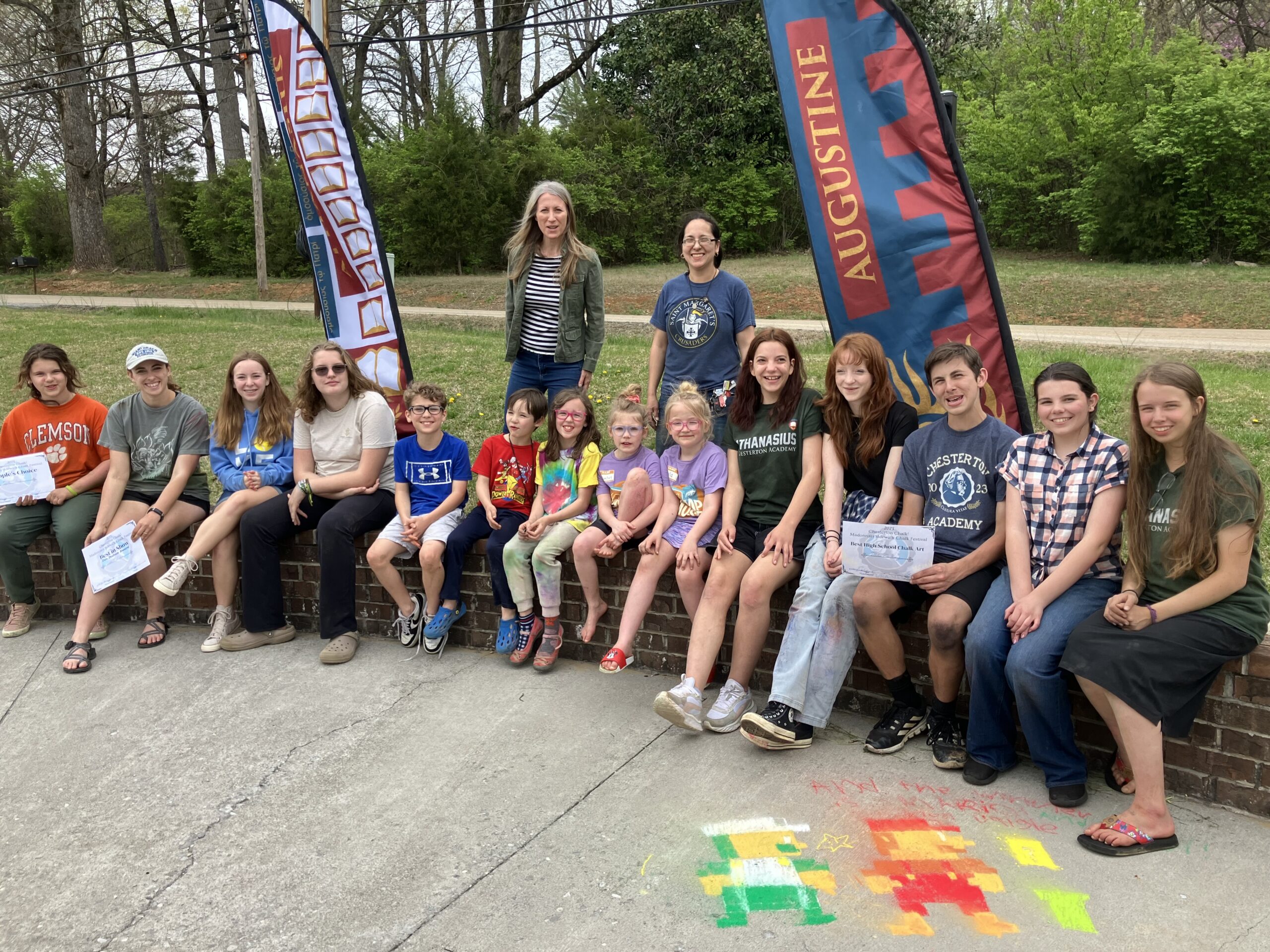 Participants in last year’s Chesterton Chalk! competition, including Chesterton Academy students and other local artists, pose with Chesterton fine-arts teacher Sonia Summers and Katie Schmid, who helped judge the 2025 competition.
