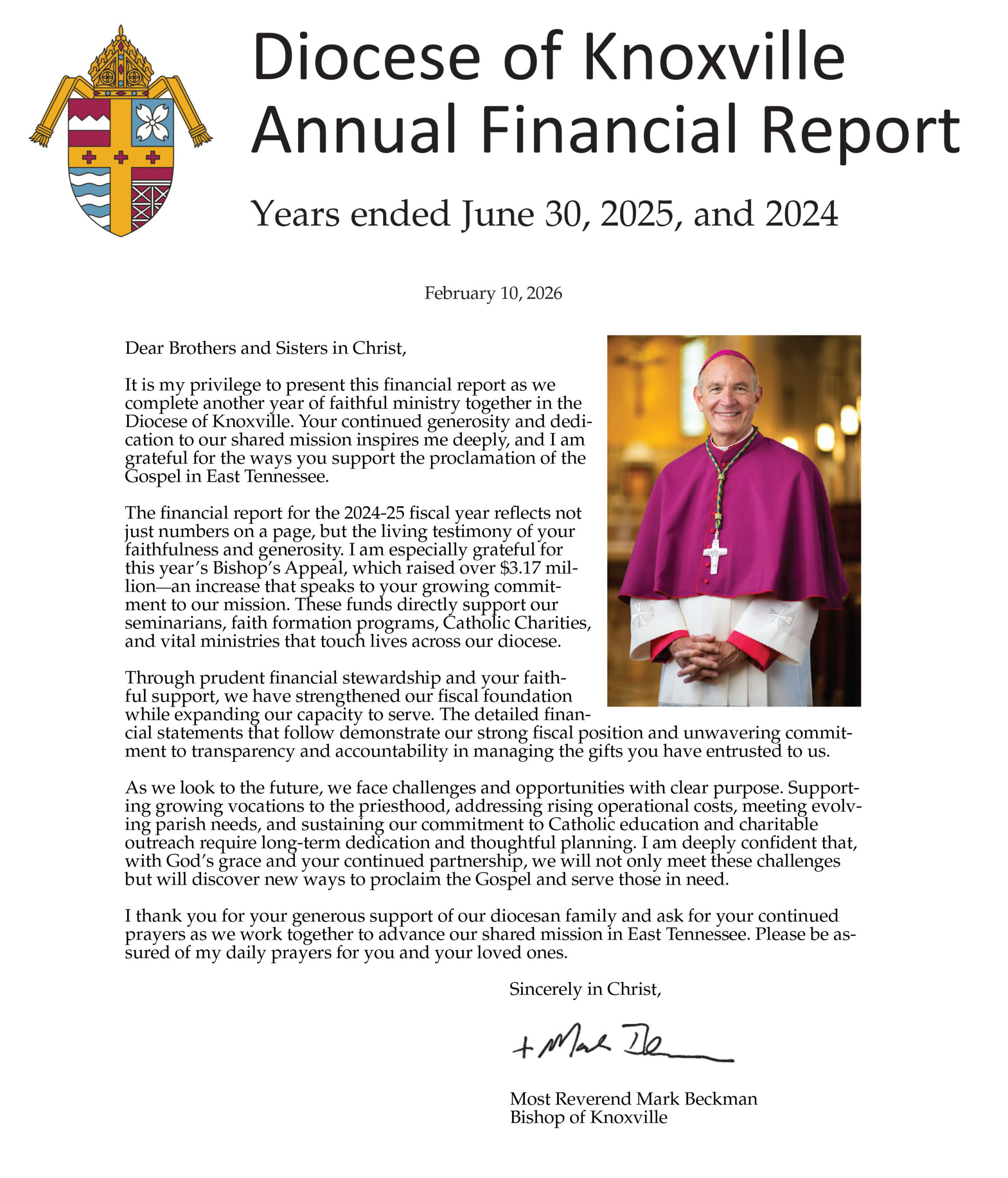 The finance department of the Diocese of Knoxville has released its audited financial statements for the fiscal year ending June 30, 2025. The statements reflect continued financial stability, prudent stewardship, and a modest increase in net assets.