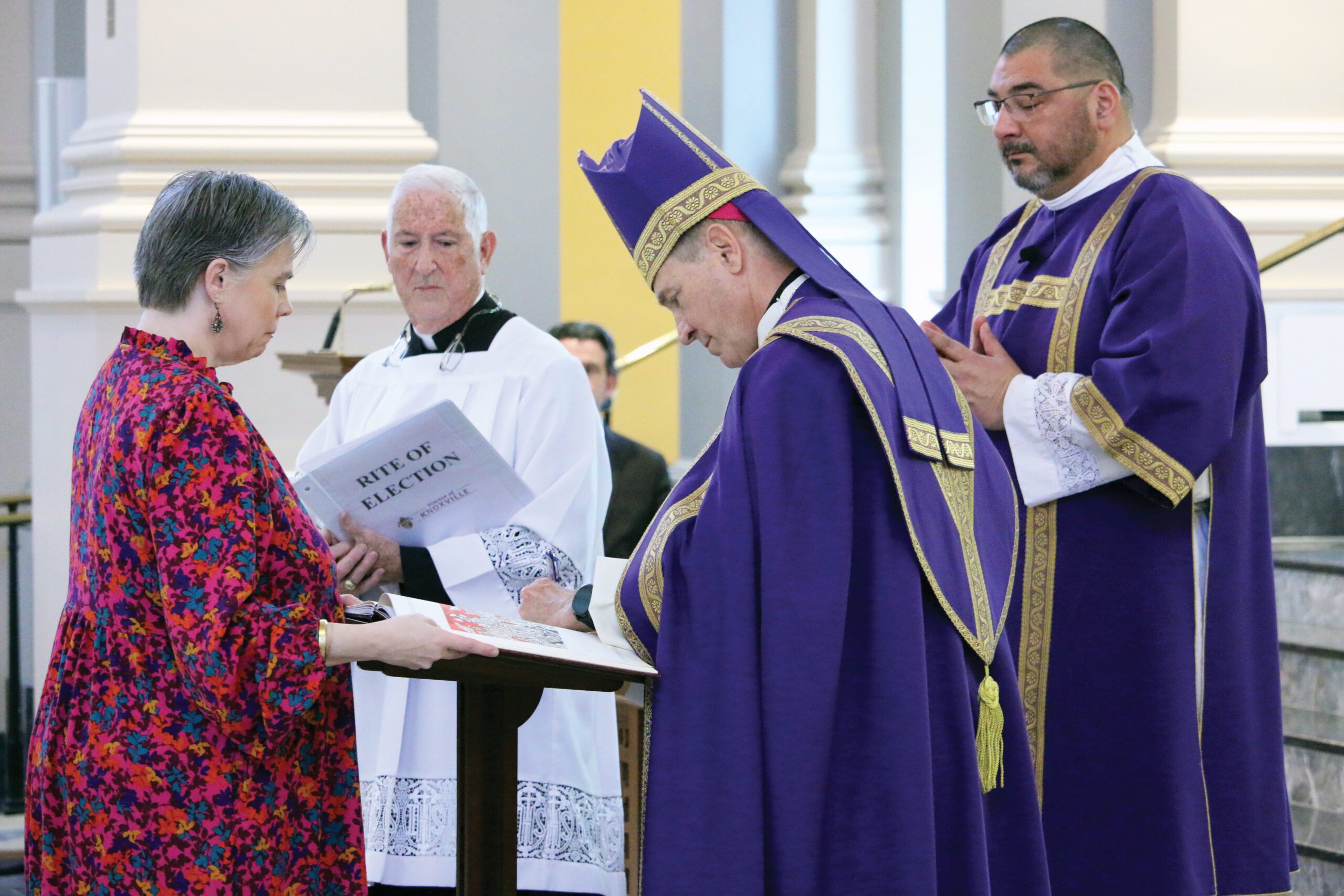 Bishop Mark Beckman signs the Book of the Elect from St. Alphonsus Parish in Crossville for its director of religious education Sara Carey. Observing are Deacons Vic Landa, right, and Walt Otey. (Photo Dan McWilliams)