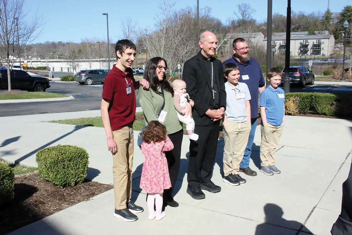 Bishop Mark Beckman joins a family for a photo following the Rite of Election at the Cathedral of the Most Sacred Heart of Jesus on Feb. 21. The family members will be entering the Church at Easter Vigil. (Photo Dan McWilliams)