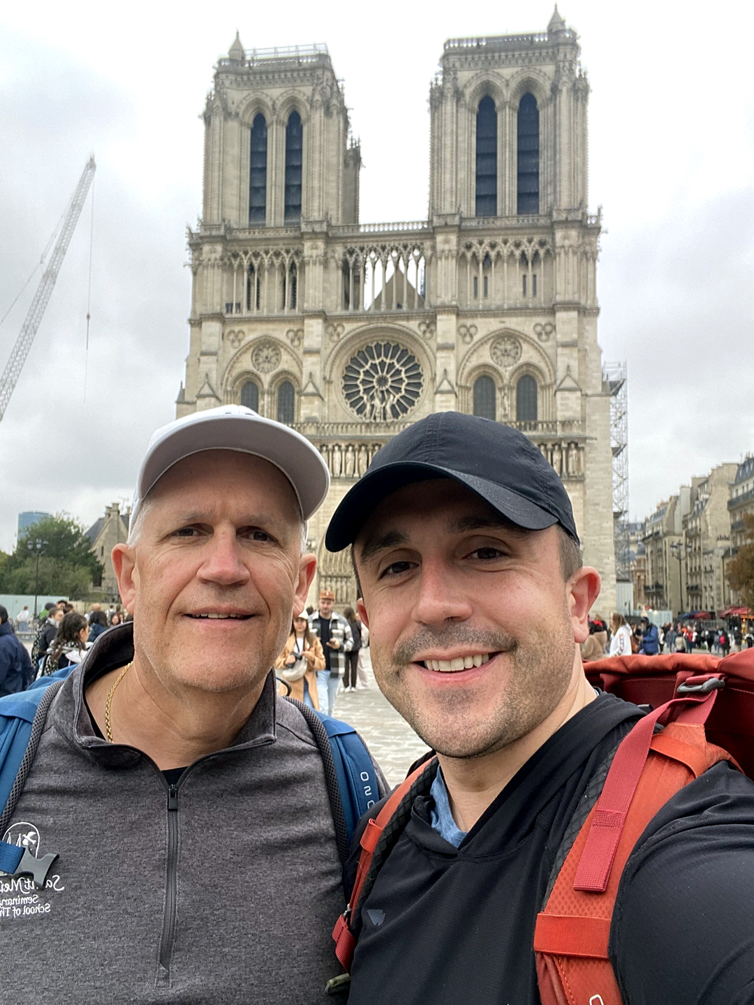 Deacon Joe Herman (left) and Father Danny Herman stand in front of Notre Dame Cathedral in Paris on the day they arrived in France from the United States.