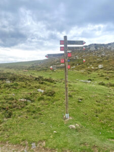 A fingerpost along the Camino walk indicates the distances in kilometers and travel time to Roncesvalles, Saint-Jean-Pied-de-Ports, and other stops.