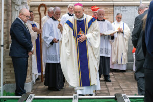 The assembly, led by the clergy, then processed out of the front doors of the cathedral and around to the adjacent columbarium entrance as they sang “How Great Thou Art.” When that song ended, Katie Helms played “Amazing Grace” on the bagpipes during the procession. Diocesan priests entered the columbarium gate singing “Salve Regina.”