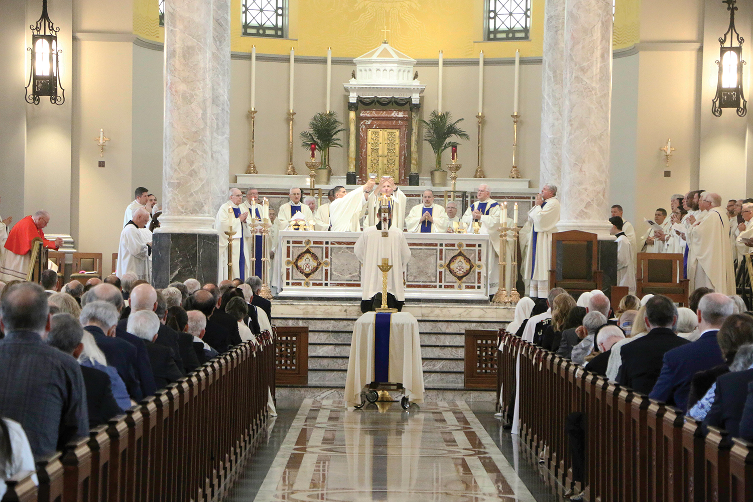 Cardinal Dolan began his homily by quoting Bishop Stika’s episcopal motto. The Latin version, Iesu Confido in Te, is inscribed on the front of the cathedral’s baldacchino, the 45-foot canopy over the altar.
