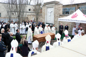 Afterward, Bishop Beckman led the Final Commendation and prayed: “Into your hands, Father of mercies, we commend our brother Bishop Richard in the sure and certain hope that together with all who have died in Christ, he will rise with Him on the last day. Merciful Lord, turn toward us and listen to our prayers. Open the gates of paradise to your servant and help us who remain to comfort one another with the assurances of faith until we all meet in Christ and are with you and with our brother forever. We ask this through Christ our Lord. Amen.”