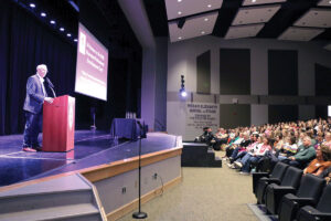 George Valadie, interim superintendent of Diocese of Knoxville schools, addresses teachers and administrators attending Professional Development Day in the St. Gregory the Great Auditorium at KCHS. (Photo Bill Brewer)