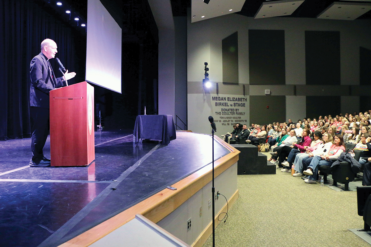 Bishop Mark Beckman gives remarks during the diocesan schools’ Professional Development Day. (Photo Bill Brewer)