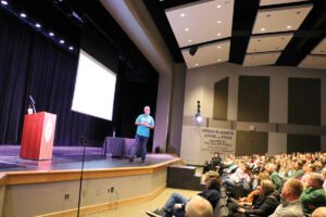 Gerry Brooks entertains the audience of fellow educators with his humorous keynote address on education and overcoming obstacles to develop a strong faculty to effectively teach students. (Photo Bill Brewer)