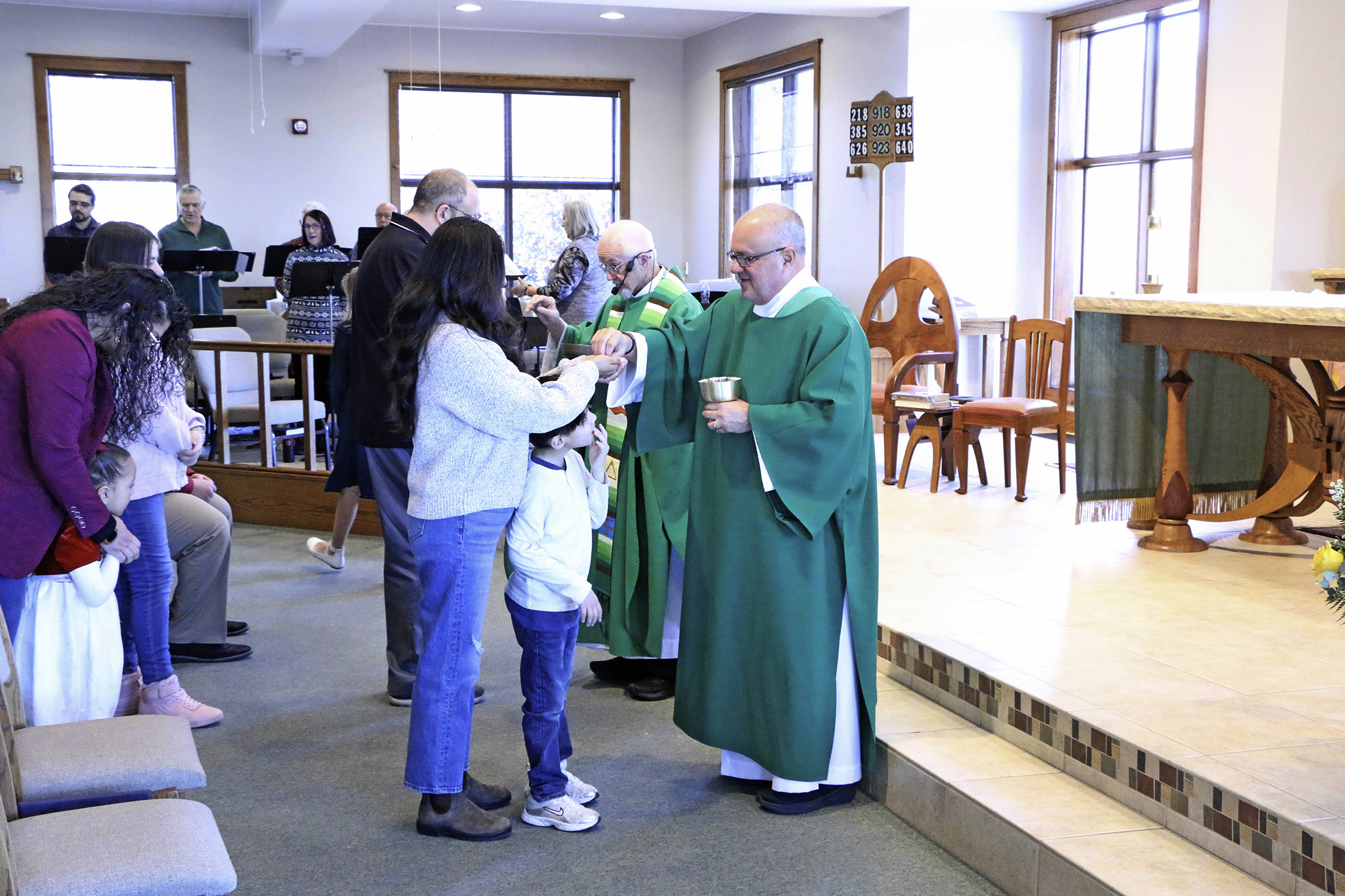 Monsignor Al Humbrecht and Deacon Jim Bello distribute Holy Communion during Mass before the volunteer activity. (Photo Bill Brewer)